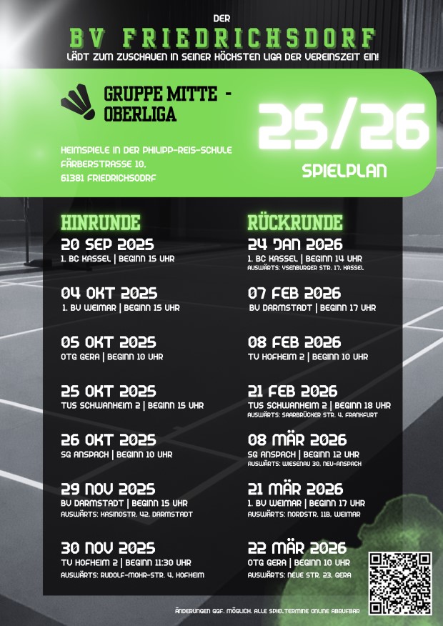 Die weiteren Spieltermine finden sich im verlinkten PDF. Die Spielergebnisse werden im Ergebnisdienst des deutschen Badmintonverbandes veröffentlicht.